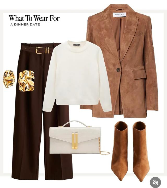 流行度很高的裘皮绒面料跟咖色西裤也适配度很高。衬托有型的西装特别有腔调感,深咖色西裤则默契度拉满,延续利落风范。用同色系短靴穿出轮廓感。白色毛衫和鎏金耳坠则是提亮元素,穿出品味很好的通勤搭配,绝对值得能干爱美的你拥有哦。