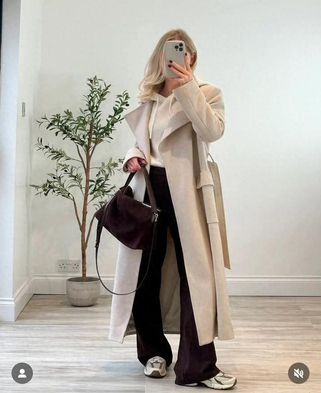 浅驼色收腰大衣一气呵成的穿出修长线条,可以与深咖色协调呼应,穿件舒适的连帽白色毛衣,搭运动鞋也很好看,穿得自在大方。
