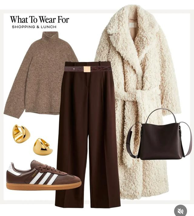 看了那么多偏硬朗风的咖色西裤搭配,这次来个柔软风格吧。白色的泰迪款大衣就很理想,细腻触感自带暖意,再穿起宽松的褐色毛衣,穿出满满的慵懒自在。